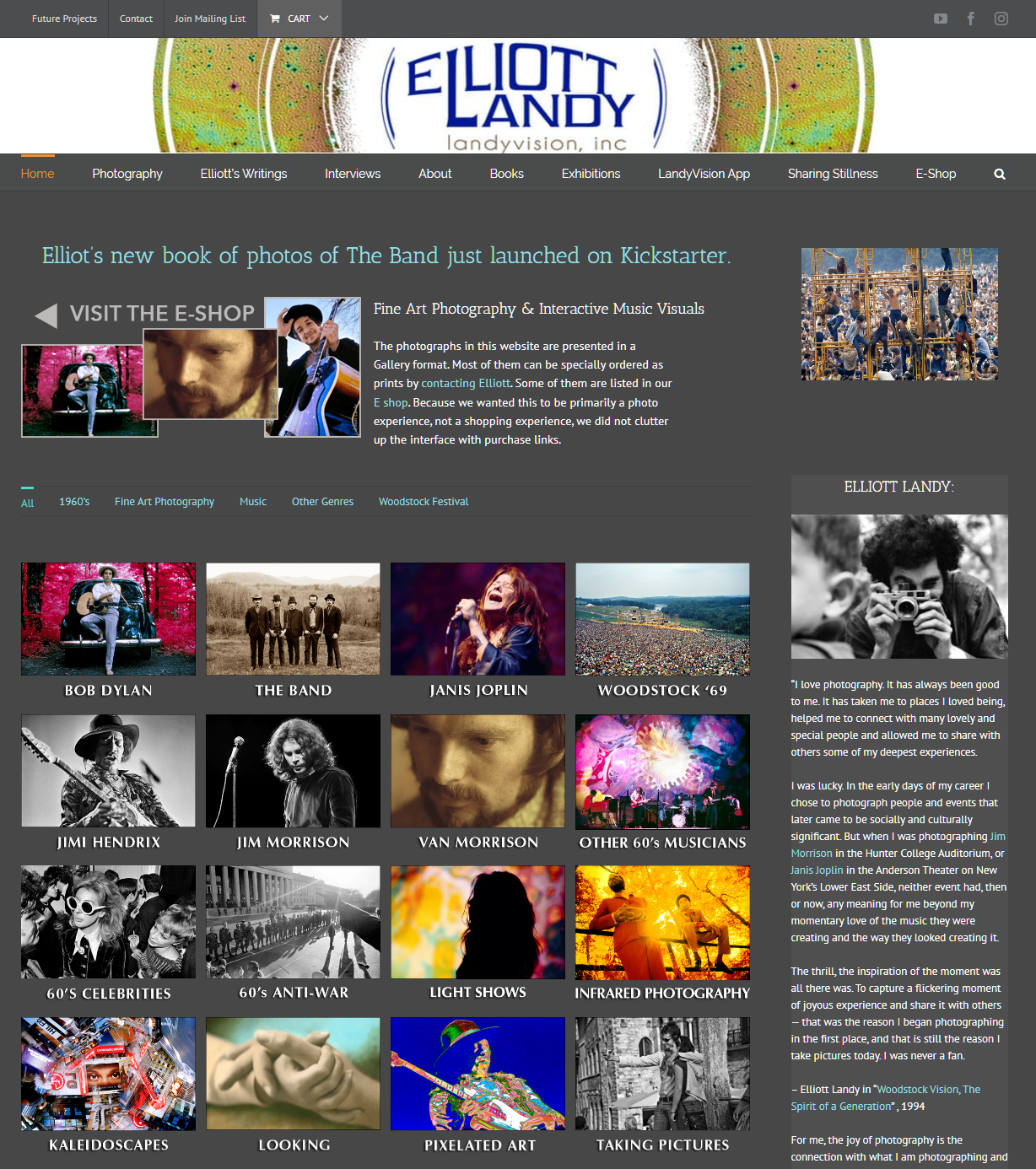 Best known for his classic “rock” photographs, Elliott Landy was one of the first “music photographers” to be recognized as an “artist.” His celebrated works include portraits of Bob Dylan (Nashville Skyline), The Band (Music From Big Pink, and The Band), Janis Joplin (Big Brother & The Holding Company: Cheap Thrills), Van Morrison (Moondance), Jimi Hendrix, Jim Morrison and many others. A photo journalist as well, his early images documented and supported the rising tide of anti-war sentiment and spiritual awakening throughout the United States during the late 1960’s.