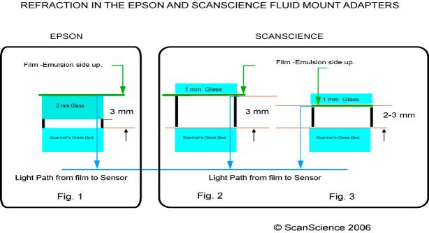 Referring to the figures below: FIG. 1 - With Epson fluid mounting tray, the image forming light travels through a total of 4 mm of glass, 2mm for the fluid mounting adapter and 2 mm for the glassbed, before reaching the sensors. FIG. 2, 3 With the ScanScience Pro Kit, the image-forming light emerging from the film is NOT refracted by the adapter's glass plate. Fig. 3 shows that the film elevation can be adjusted by fractions of a mm. to match the optimum focus plane of the scanner actual unit, which may differ from the nominal optimal